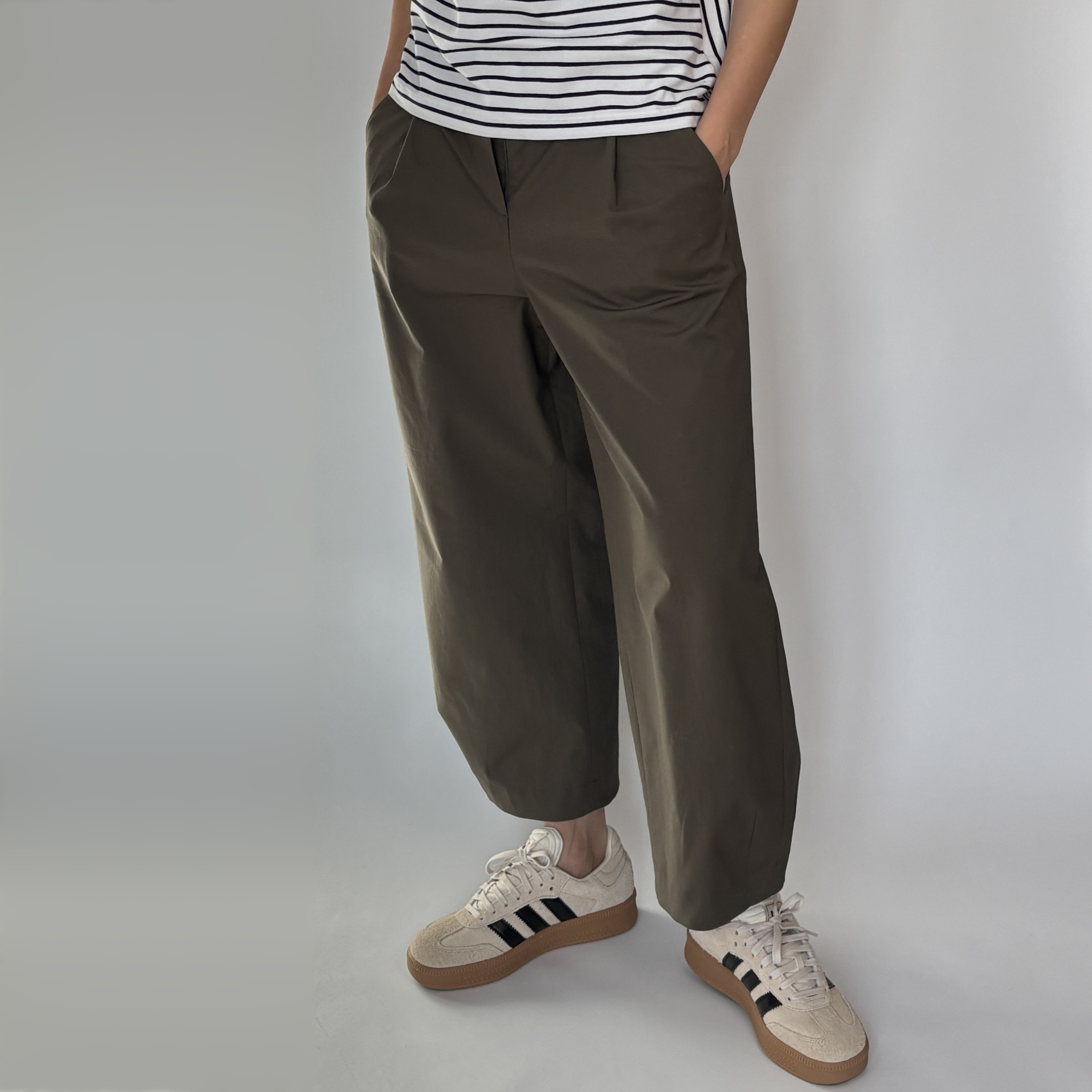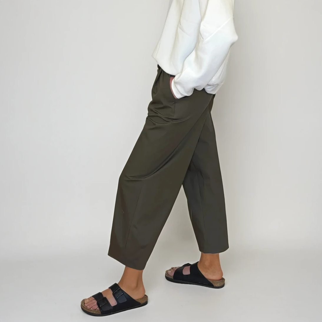 „LIME“ ist eine Barrel Hose mit charakteristischer, leicht abgerundeter Beinlinie. Sie sitzt kurz unterhalb der Taille und ist knöchellang.